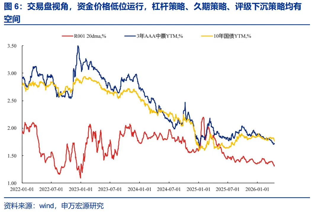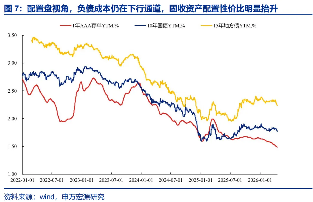 配置盘关注负债成本与资产选择,交易盘关注资金宽松、负债扩容与宏观信号。对配置盘(以银行、保险为代表)而言,重要的决策依据是负债成本与资产比价。在负债成本下行、优质资产供给有限的背景下,其行为具有趋势性和稳定性。目前来看,配置盘的负债成本仍在下行通道,固收资产配置性价比明显抬升。对交易盘(以资管产品为代表)而言,则对资金松紧、负债流入速度以及宏观边际信号更加敏感,目前来看,交易盘视角,资金价格低位运行,杠杆策略、久期策略、评级下沉策略均有空间。