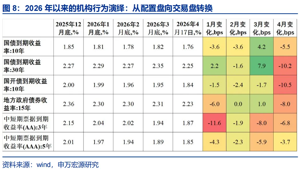 2026年以来的机构行为阶段演变:1)1-2月,配置盘“抱团取暖”,交易盘谨慎跟随。2)3月,配置盘力度边际减弱,交易盘情绪转为谨慎参与。 3)4月以来,配置盘“抱团”面临挑战,交易盘“抱团”开启加速模式。