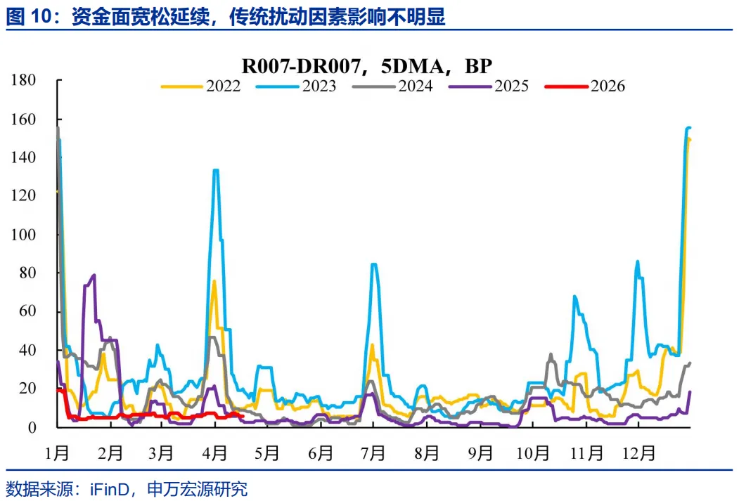利空因素多为“慢变量”,聚焦通胀回升、财政发力等维度。目前来看,通胀可能延续温和回升的节奏。二季度CPI、PPI中枢预计小幅抬升,对货币政策构成轻微约束,但其回升节奏温和,且可能伴随企业盈利改善,对债市的影响并非单向。这更多是一个需要观察的慢变量。财政政策发力节奏可能依然较快,政府债券的供给放量是市场共识,但发行节奏和央行对冲配合更为关键。在“资金面平稳”的预期下,供给冲击更多是阶段性扰动而非趋势逆转因素,同样属于慢变量。
