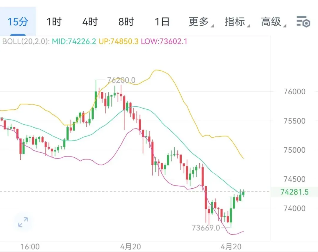 各位朋友们,周一晨安。回顾凌晨至今大饼延续了周末晚间的回落走势,从76200阶段高点承压下行,最低下探至74550一线,随后在低位获得承接,当前在74200-74800区间震荡整理,整体呈现震荡偏弱格局,空头动能在早盘有所衰减。本轮回调属于前期大涨后的技术性修正,跌破了布林带中轨支撑,并在此位置附近弱势震荡,反弹高点逐步降低,下跌低点同步刷新,这是标准的下降趋势。