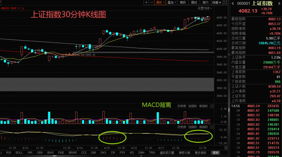 30分钟K线图中,反弹进行中,但指数新高后,MACD成背离,要警惕。