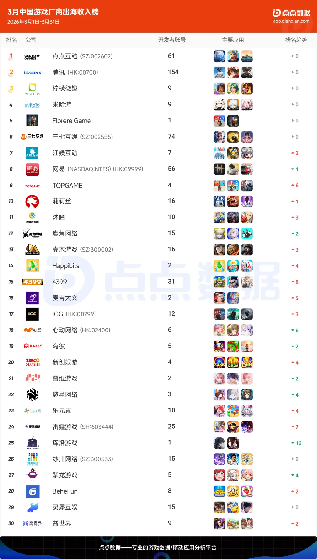 不知不觉间四月已经过半,而在三月的游戏市场中同样迎来了激烈的竞争,各大厂商除了全力争取国内市场的流水之外,在海外市场也纷纷布下了新年新季度的规划,以求把产品放到更多的领域中。接下来我们就一起来看看三月份的国内游戏厂商海外营收情况统计,看看谁才是国内外的双赢选手!从榜单数据来看,点点互动无疑是三月份出海厂商的最大赢家,其收入数据环比增幅提升了14.9%。依靠《无尽冬日》的全球收入再突破,点点互动来到了厂商的前列。这款冰雪末日题材的SLG自2023年上线以来就凭借独特的玩法组合快速席卷全球,登顶地区的畅销榜,并在接下来的时间中快速吸金发展,成为了一项长久运营的成功作品。