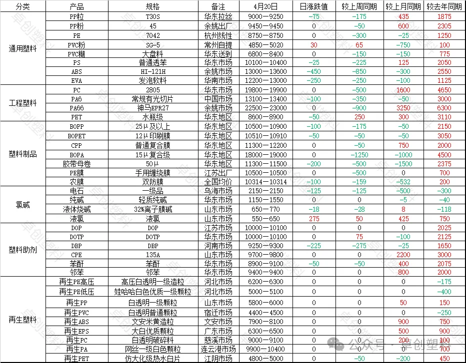 语2026-04-20行情汇总及展望,PP粒下跌75、PP粉无浮动、PE无浮动、PVC粉上涨30、PVC糊无浮动。塑料每日收盘汇总