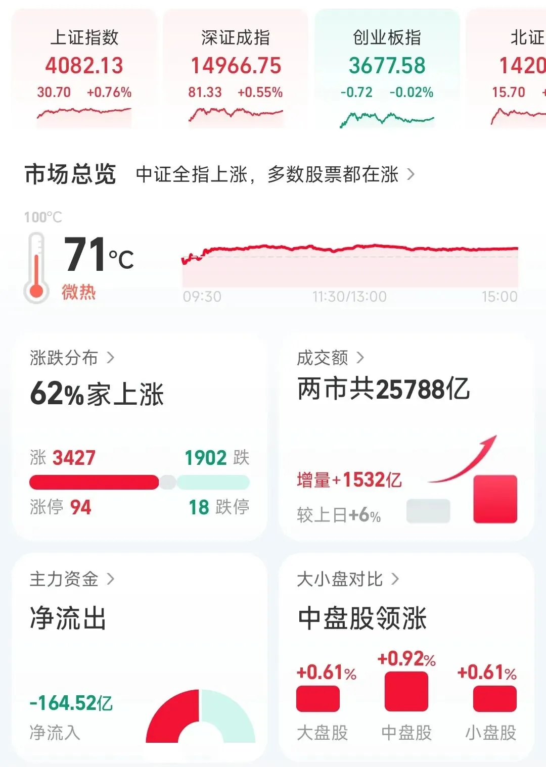 1. 上证指数:收报4082.13点,上涨0.76%。上证指数早盘前半个小时的拉升奠定了今天的主基调,随后的大部分时间都是处于平盘震荡状态,尾盘的一波上涨使其收于全天的最高点附近。