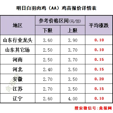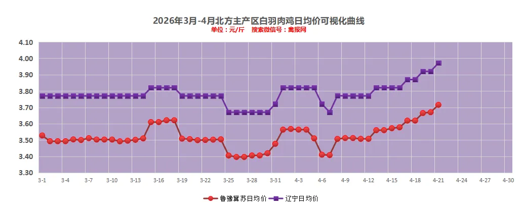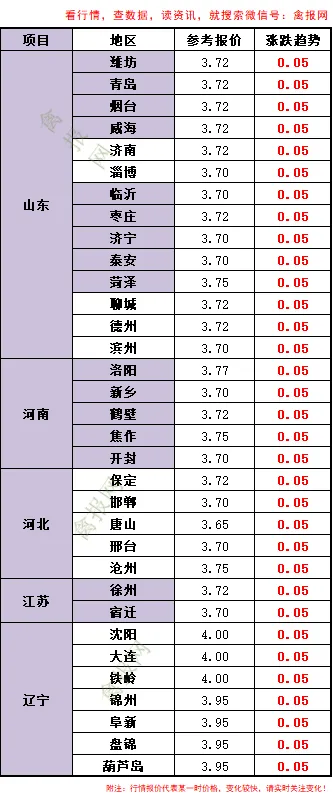 (2)明天(4月21日)辽宁区域“到厂价格”较上一日统一报价上涨5分,主流报价在3.95-4.00元/斤区间上下。