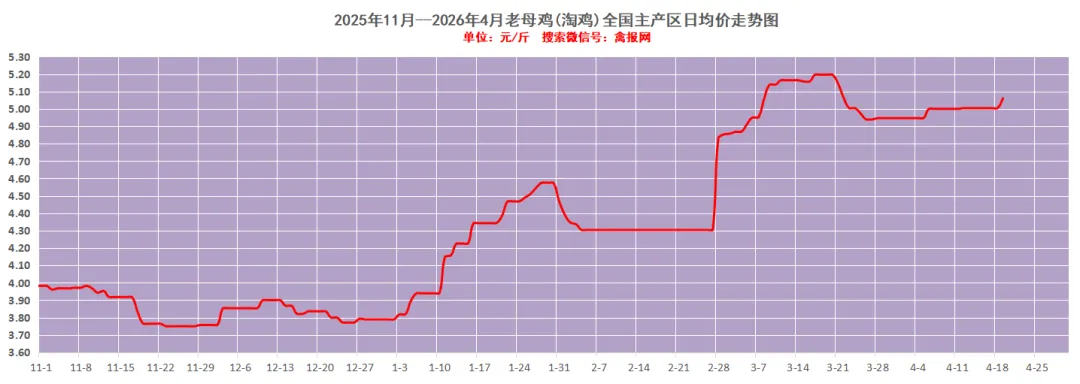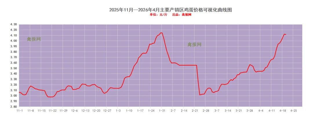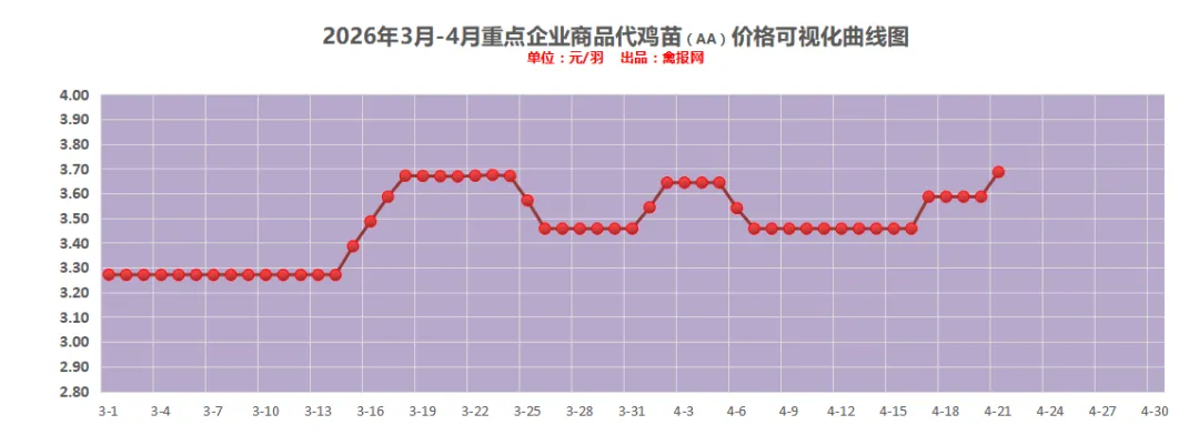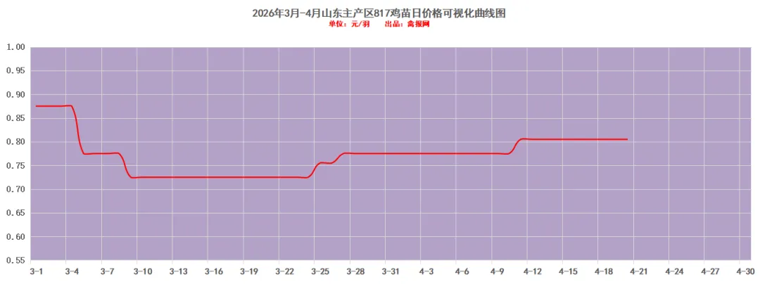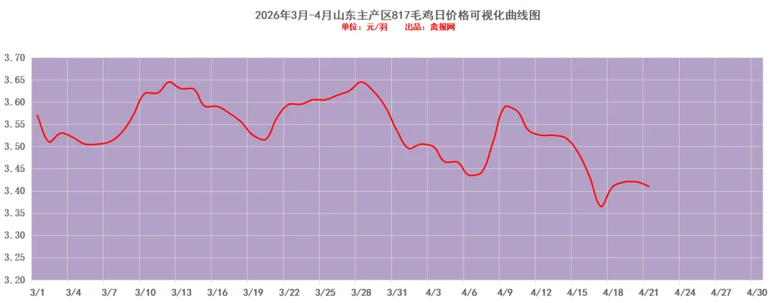 附注:2022-2023年每日毛鸡价格走势图(需求各种产业数据可后台留言)从监测样本商品苗销售数据看,2026年第14周(2026/4/6-2026/4/12)鸡苗销量数值区间在9620万羽左右(上周在9425万羽左右),较前一周环比上升了2.07%,理论上对应出栏时间在2026/5/17-2026/5/23日期间。(实际养殖过程中仍要考虑成活率等因素,以上数据只是理论销售数据)。(附注:4/20日更新)龙头孵化大场——山东报价上涨了0.10元/羽,辽宁报价上涨了0.10元/羽,具体价格为:山东报价3.90元/羽;辽宁报4.00元/羽;山东、河南、河北、江苏、安徽以及辽宁等主产区重点孵化场综合均价3.69元/羽,较上一日报价上涨了0.10。今天苗厂计划不一,总体顺利,局部显慢,主要是随着苗价的上涨部分养户补栏观望。当前多点签订风险共担合同价格3.45-3.50元/斤区间上下。主产区今日综合均价1.88元/枚,较上一日报价保持稳定。具体情况:行业龙头厂家报价区间一般在1.90-2.40元/枚;分区域中小场报价:辽宁区域参考价格1.60-1.70元/枚、河南山东区域参考价格1.80-1.90元/枚。明天(4/21日)北方地区(聊城、德州、济南、新乡四个主产区)817毛鸡综合日均报价下跌了0.01,综合均值为3.41元/斤。今天(20日)主产区出箱综合均价保持稳定,主产区结算参考均价0.81元/羽左右。主流报价区间0.50-0.55元/枚,较上一日报价保持稳定。2、【今日价格行情综述】
