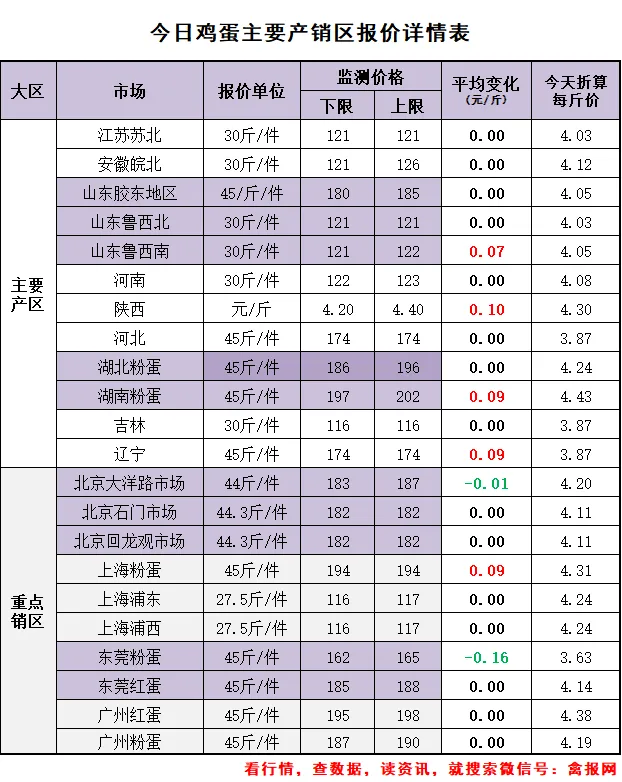 其中:主要产区综合均价4.06元/斤,较前一日上涨了0.02元/斤;主要销区综合均价4.15元/斤,较前一日报价下跌了0.01元/斤。