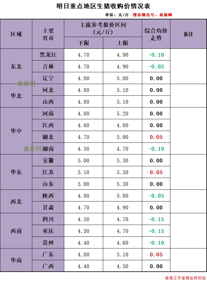 明天(4月21日)全国重点地区生猪综合均价为4.83元/斤,综合日均报价相较上一日下跌了0.03。