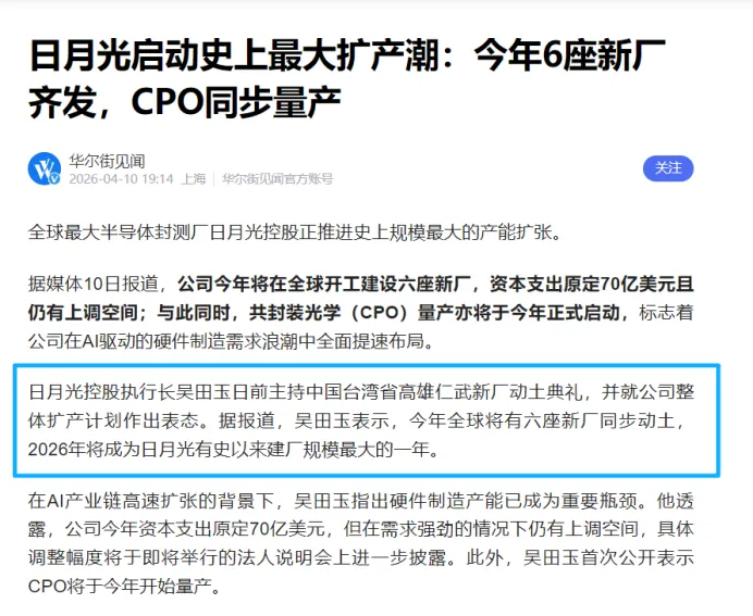 全球封测龙头日月光今年要动工6座新工厂,这可是史上最高记录!
