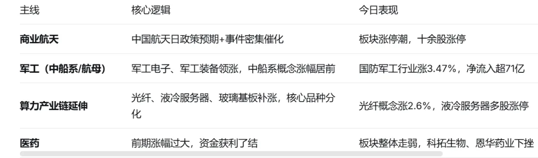 今日市场核心特征:商业航天成最强主线(政策预期+权重股联动+涨停潮),算力产业链内部高低切换明显(核心品种冲高回落、边缘细分大幅补涨),国防军工获主力资金大幅净流入72亿元,成为资金进攻的主战场。
