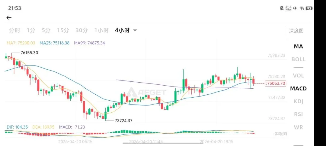 2026年4月20日比特币4小时,当前市场呈现以下关键特征:
