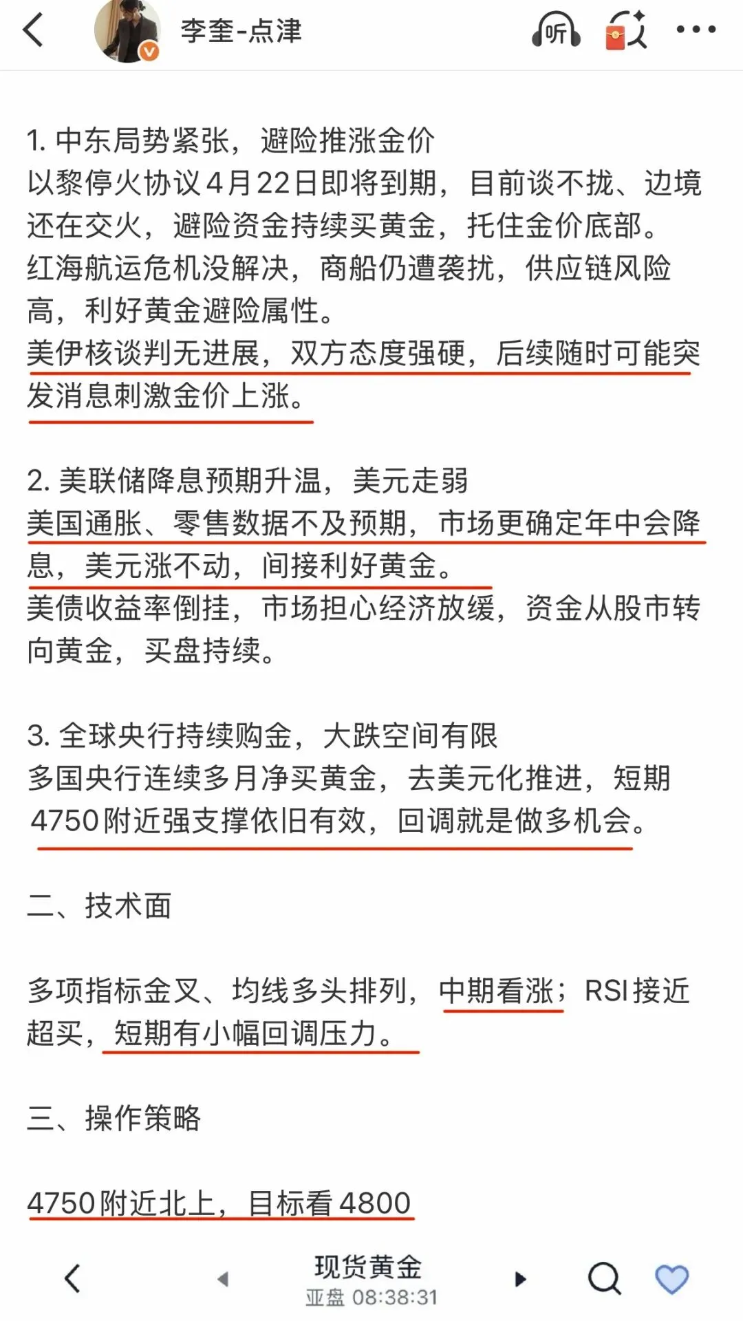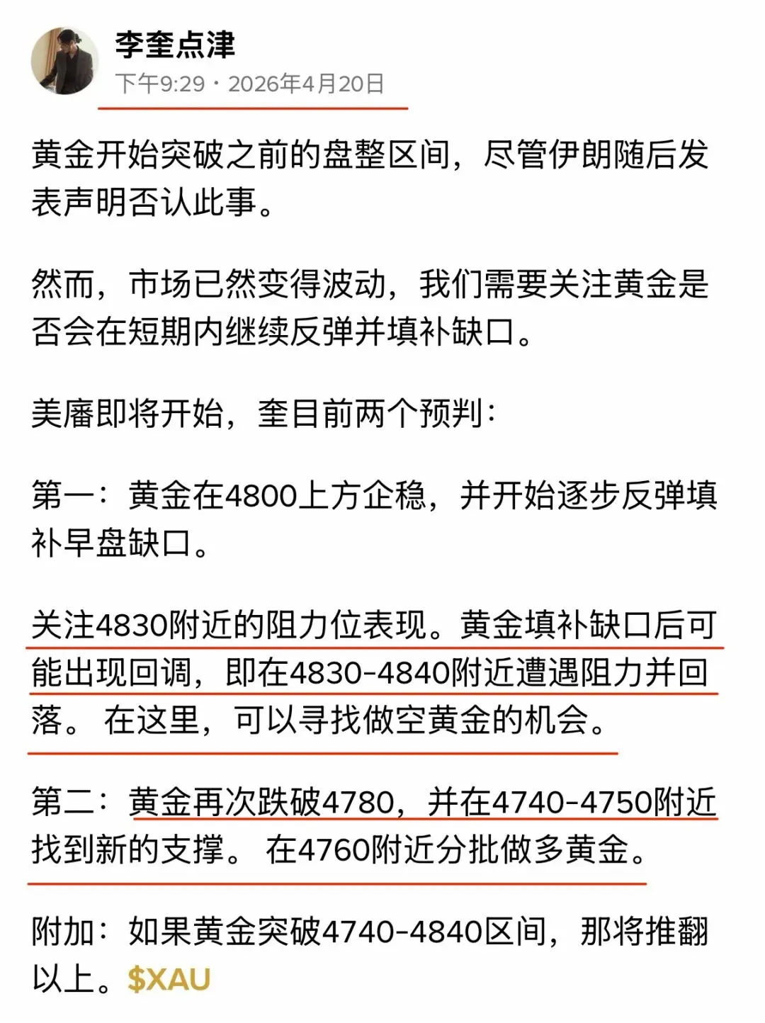 💡 行情复盘:晚间4830压力位明显,美盘冲高回落、回踩小区间顶部支撑,完全契合奎此前给出的高空低吸买入条件。📉 后市思路:当前暂不具备大幅拉升条件,明日重要谈话落地前,市场情绪仍以观望为主。方向未明之前,继续坚守 低吸策略,耐心持有即可