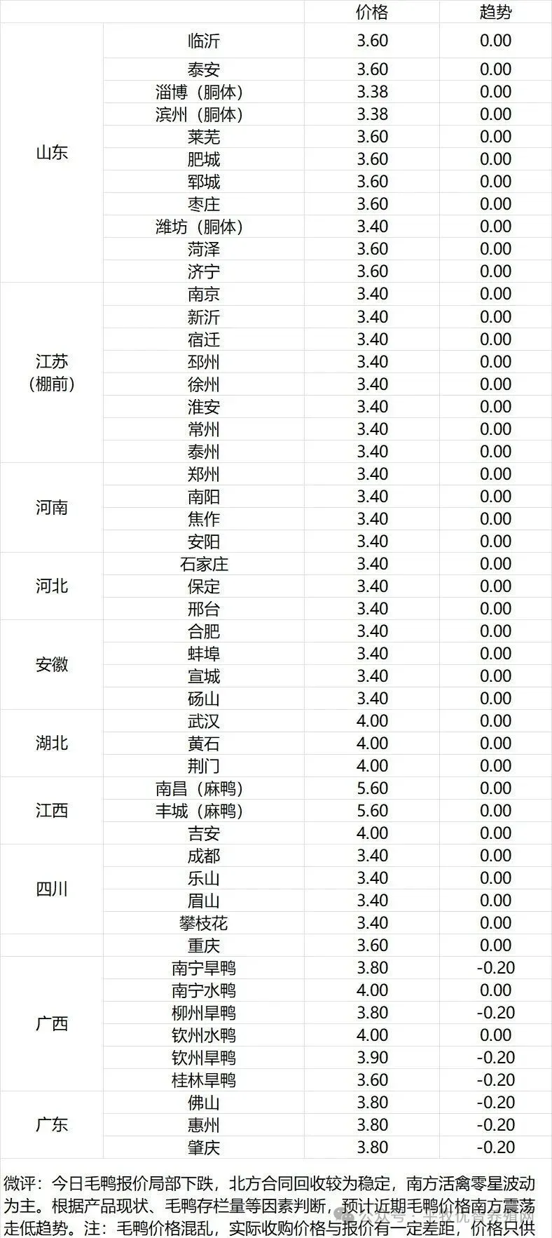 微评:鸭苗报价稳定。(注:南方只报当天价格)养殖端补栏情绪略有回升,大厂控量保价,市场走货回暖。根据产品、养殖成本及鸭苗现状分析,预计近期鸭苗价格呈止跌企稳趋势。种蛋报价落5分。温馨提示:该价格为主流厂家报价,实际销售价格以成交价格为准,价格仅供参考。