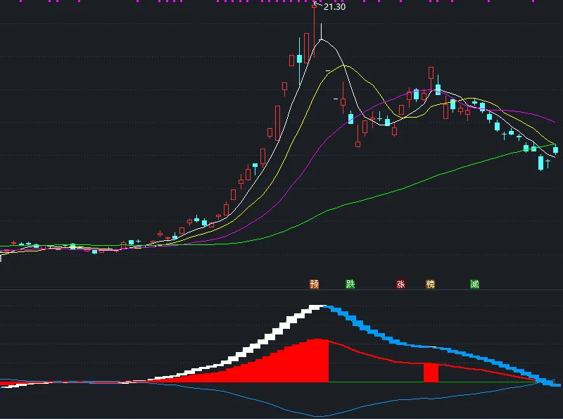 反过来,股价创新高,紫线却走平或向下,这是"顶背离",暗示上涨动能不足,要警惕回调。