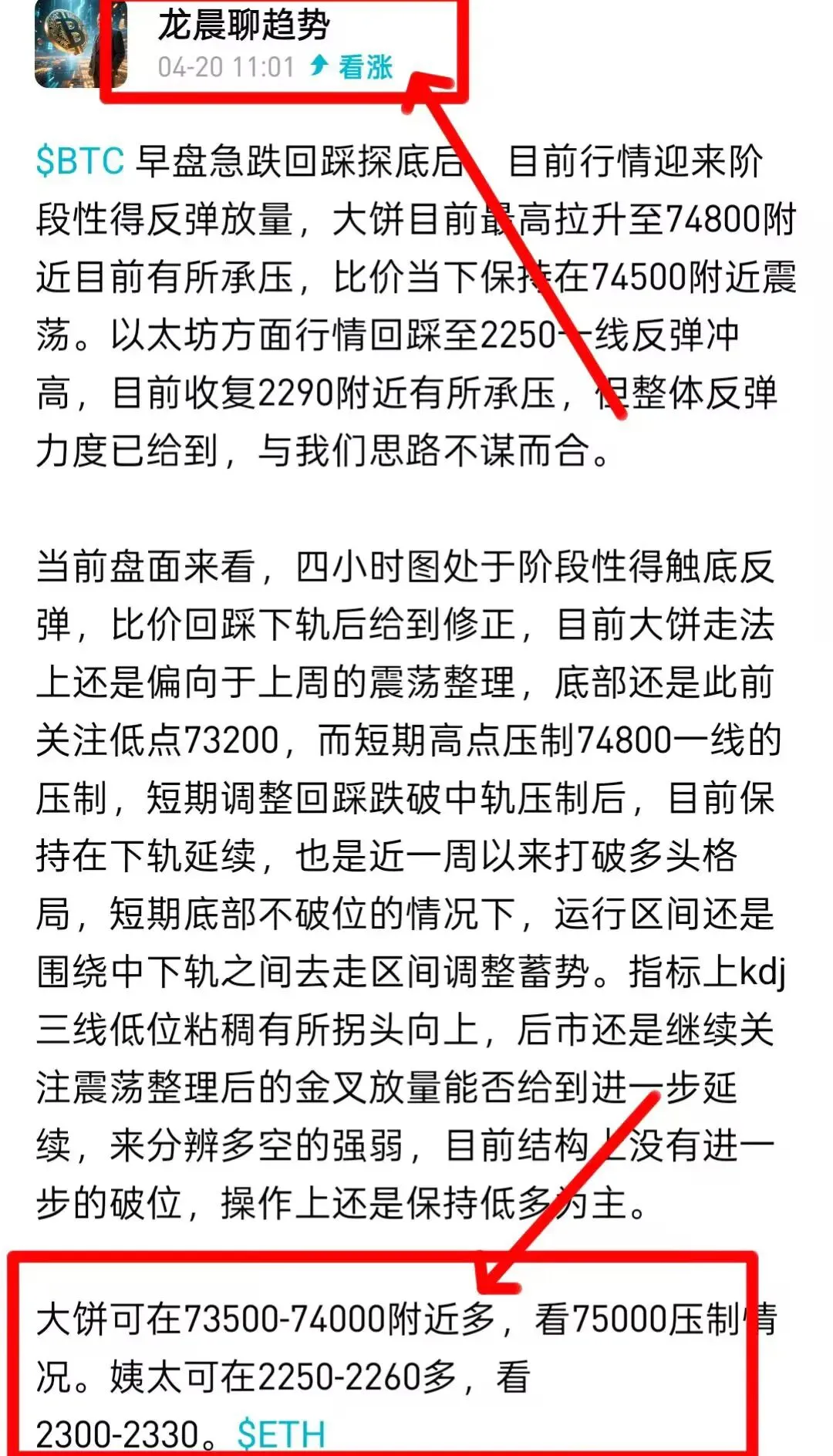 回顾日内行情,大饼早盘先是迎来空头放量回撤,币价迎来阶段性调整,最低跌至73800附近受阻反弹,早盘至午间最高拉升至74700附近承压回落,午间跌至74000一线受阻反弹,随着午后消息面进一步刺激,币价整体还是围绕74500-75500震荡调整,目前行情再度收复至75500附近,后市重点关注上方破位情况。以太坊与大饼做法基本一致,早盘回踩试探底部2250一线反弹冲高,日内最高拉伸至2330一线承压,目前还是保持在2300附近震荡调整。日内早盘我们布局多单顺势上看,周午后行情进一步反弹,冲高后布局空单抓回踩也小有利润,日内大饼总计落袋3350点空间,姨太总计落袋115点空间。日内高低点均提前搞出,压力支撑也同步提前布局,这还有何拿不到力的理由。