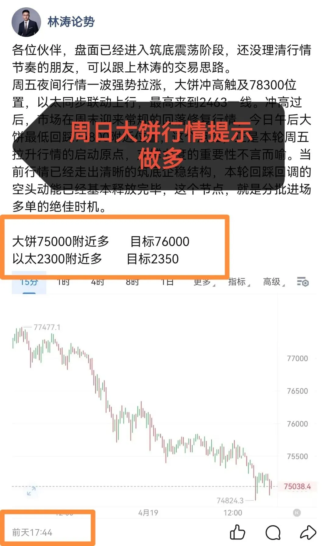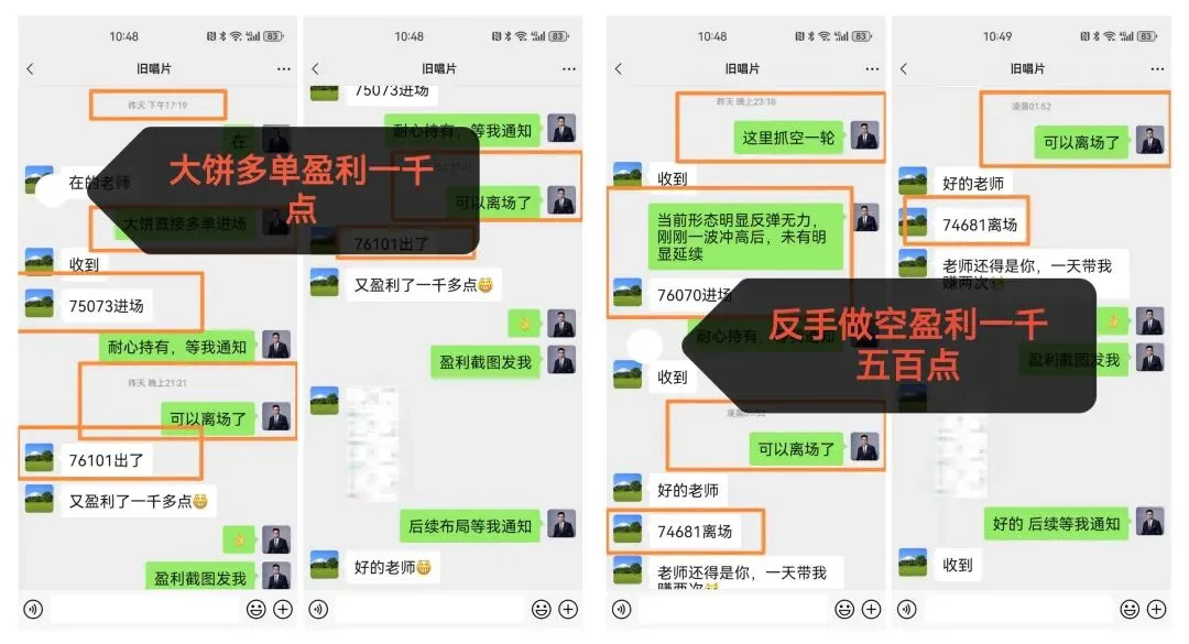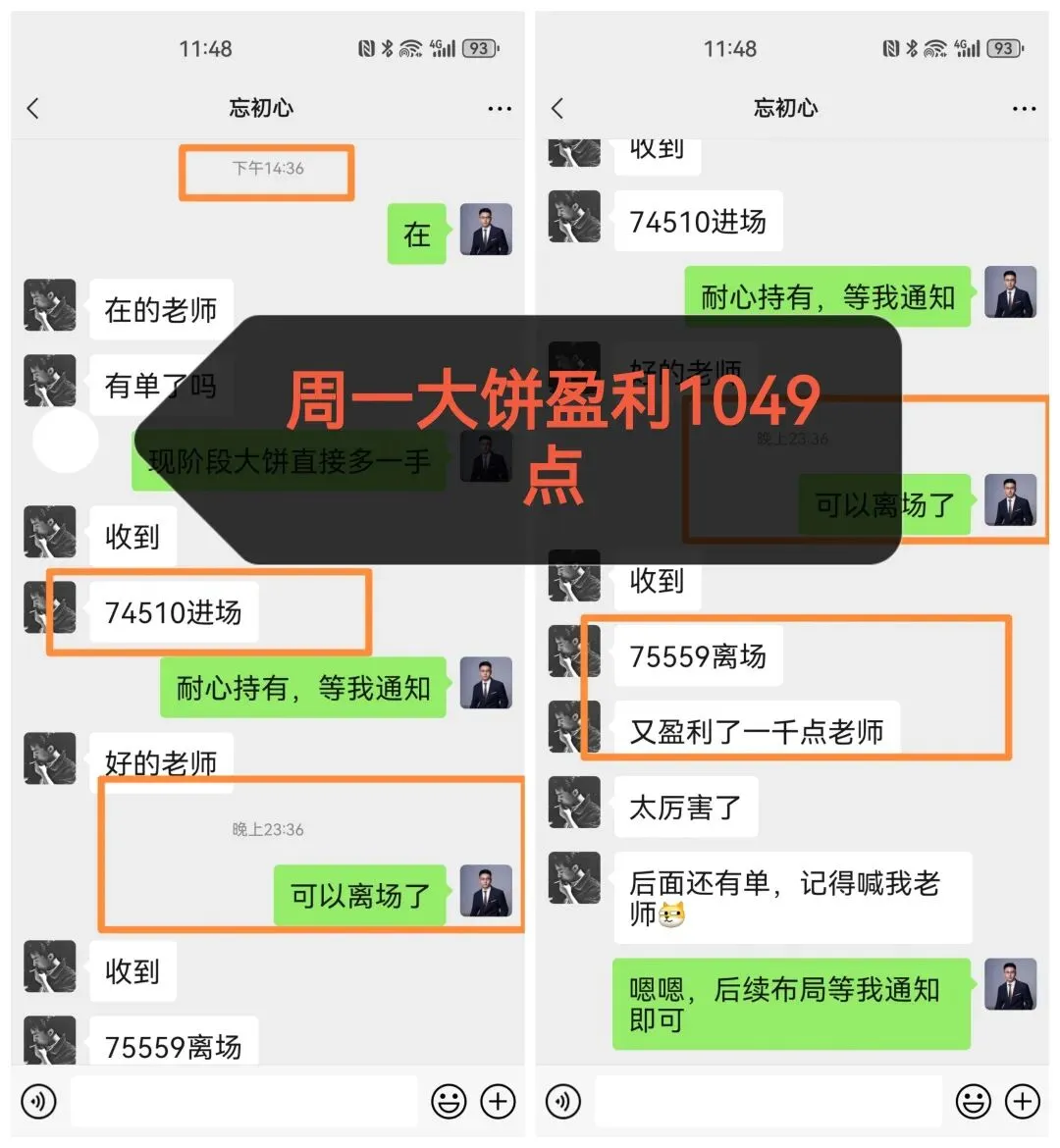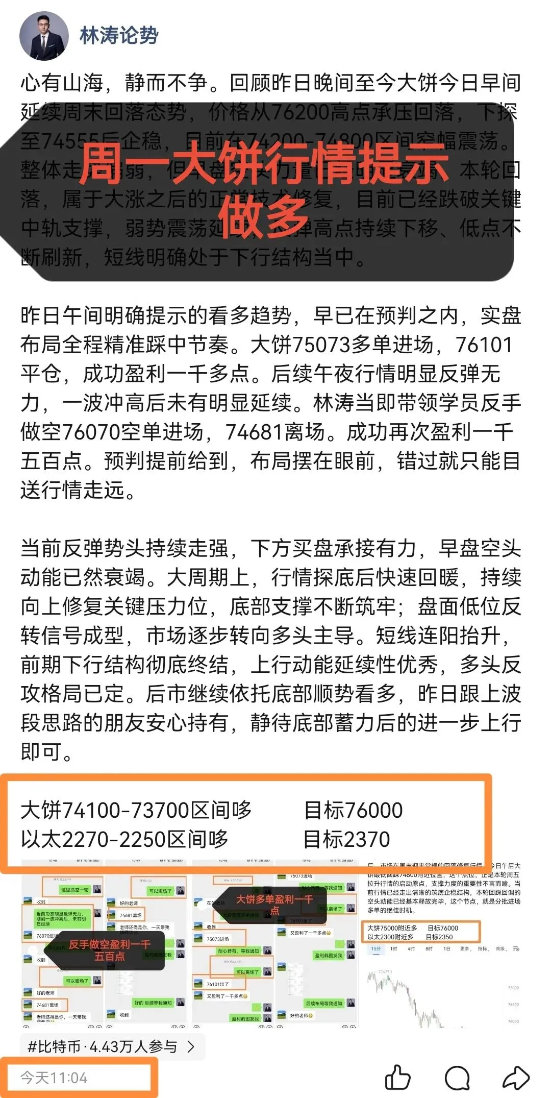 周日午间明确提示的看多趋势,早已在预判之内,实盘布局全程精准踩中节奏。大饼75073多单进场,76101平仓,成功盈利一千多点。后续午夜行情明显反弹无力,一波冲高后未有明显延续。林涛当即带领学员反手做空76070空单进场,74681离场。成功再次盈利一千五百点。预判提前给到,布局摆在眼前,错过就只能目送行情走远。昨日午间林涛已经提示到位,带领学员在午间大饼74510进场,75559止盈,成功斩获1049点