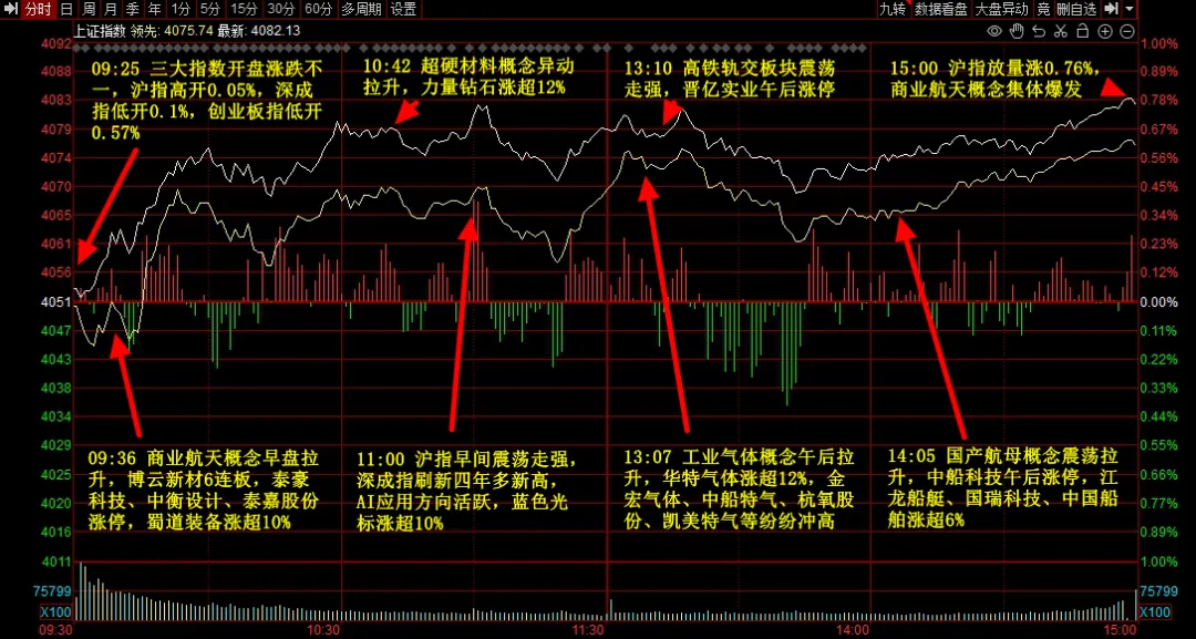 1.指数与量能:上证涨0.76%,收在4082点,比较稳。关键看成交量,今天放量6.3%,达到了2.61万亿。这是个积极的信号,说明在当前位置,有增量资金在试探进场,市场水位在抬高,流动性是充足的,这为题材炒作提供了舞台。