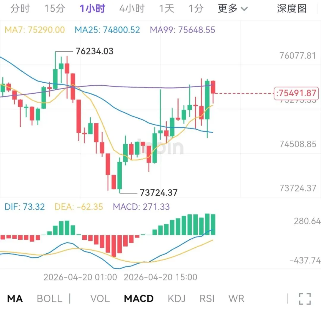 从当前盘面来看,价格冲高至76500高点后,连续收出两根回落阴线,上方76500-76600区间抛压沉重,多头无力突破,显示上行动能已经耗尽,空头力量开始主导短期节奏。MACD于高位形成死叉,多头能量柱逐步收缩并转为空头放量,同时并未出现底背离结构,说明当前回调动能仍未充分释放,短期仍有继续下探的可能。操作上还是围绕空单布局。