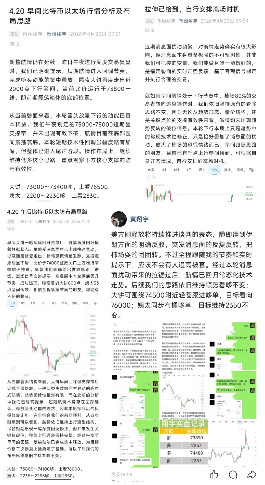 日内大饼整体波幅算不上多大,早磐时段一轮回调,比价下探73600一线确认企稳后展开修复,整体维持震荡上行节奏,于晚间最高触及75700附近;姨太走势相较大饼更为平缓,日内波幅收窄,单日最高长幅不足80点。日内我们公开给出三笔做哆思路,全程实时跟进并在进场、离场关键节点提示,三笔哆单全部止赢离场,共计斩获大饼2422点、姨太88点箜间落袋。
