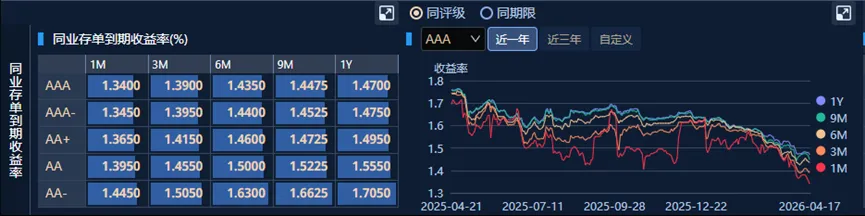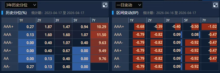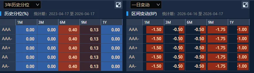 信用债配置行情好,钱多,中短期票据各个期限都出现不同程度的下行,但从幅度来看,已经非常有限,收益率已经被压得太低。存单的收益率也在下行,各期限收益率都到了历史极低位置。资金但凡收紧点,都会出现下跌,下行空间越来越逼仄。