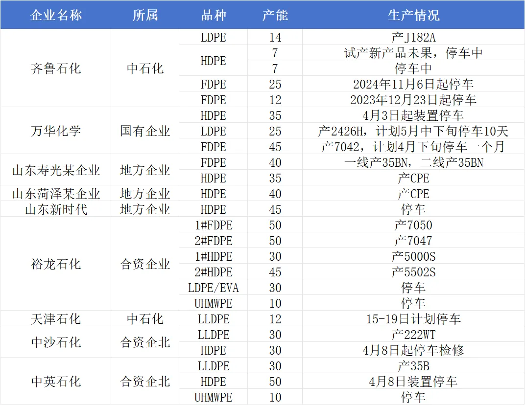 万华化学:多套装置近期陆续检修,其中HDPE装置从4月初就停了,高压聚乙烯产线计划5月中下旬停车约10天,FDPE装置也计划4月下旬停车一个月,LDPE、HDPE供应都会受影响;