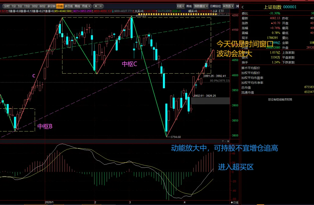 日线图,昨天阳线序列高9,进入超买区域,且今天仍是时间窗口,从动能看原有仓位可持股,不宜新增仓位追高。