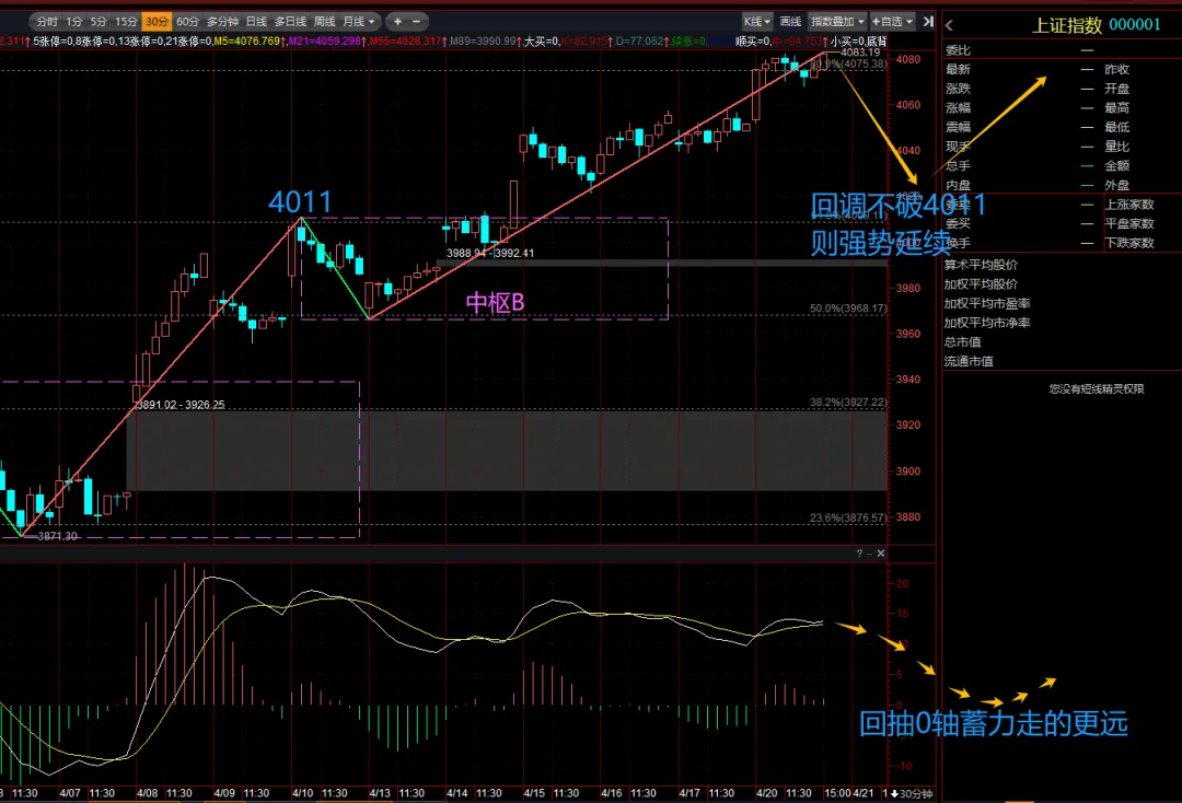 30分钟图,动能衰减明显,但有未明显背离,回调一笔且MACD回抽0轴后仍会继续上攻,但可持股不宜新增仓位追高。