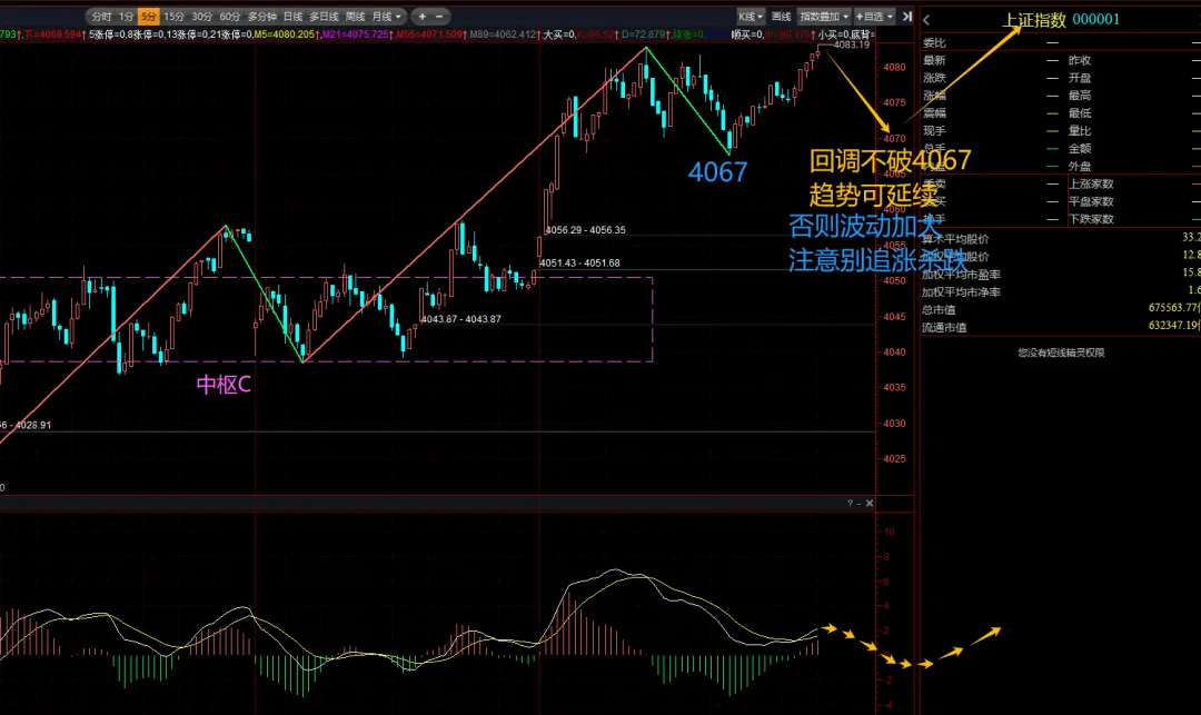 5分钟图,支撑点上移至4067,回调不破仍可持股,且只要有新高即可趋势延续。破4067,波动放大。