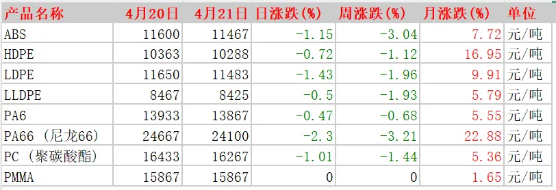 产品名称 | 4月20日 | 4月21日 | 日涨跌(%) | 周涨跌(%) | 月涨跌(%) | 单位 |