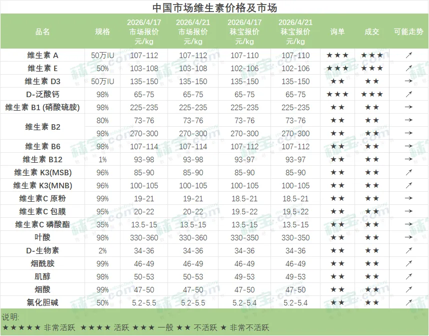 中国维生素市场调整运行,下游观望消化库存为主。维生素A主流厂家维持停报停签,限量供应,贸易渠道观望为主,购销转淡,市场价格窄幅震荡。维生素E主流厂家挺价意愿较强,工厂高低搭售签单较弱,下游刚需采买,消化库存为主,VE市场价格暂稳。维生素D3有工厂提价,市场价格暂稳运行。泛酸钙厂家报价上调,市场实际成交有限,价格暂稳运行。氯化胆碱原料供应紧张,工厂搭配发货,市场价格坚挺。
