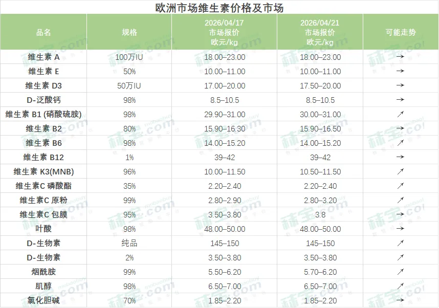 欧洲市场维生素价格及市场