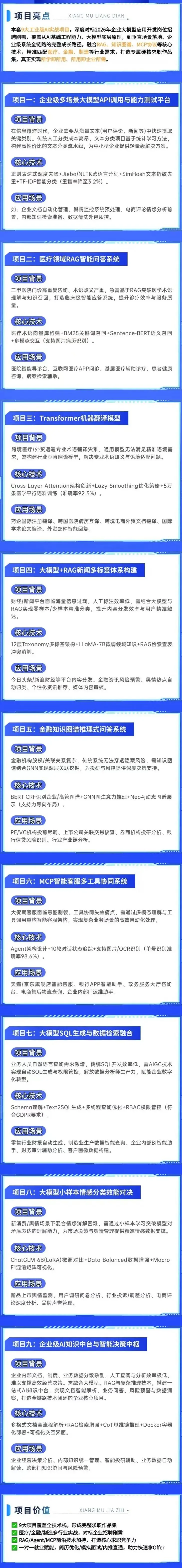 - 真实项目实战不是Demo!一线大厂导师带你做企业级项目,覆盖:医疗RAG智能问答、金融风控、MCP智能客服、企业级数据自助分析平台、个性化新闻资讯推荐等热门场景;