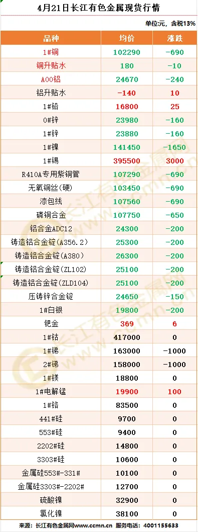 >4月21日长江有色金属现货行情