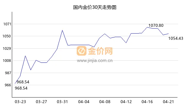 今日国内金价下跌,现价1054.27 元/克,下跌-0.16%,今日开盘价1054.56,最高价1057.84,最低价1051.59。