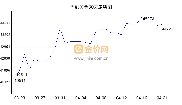 今日香港黄金下跌,现价44720 港币/两,今日开盘价44865,最高价44962,最低价44671。