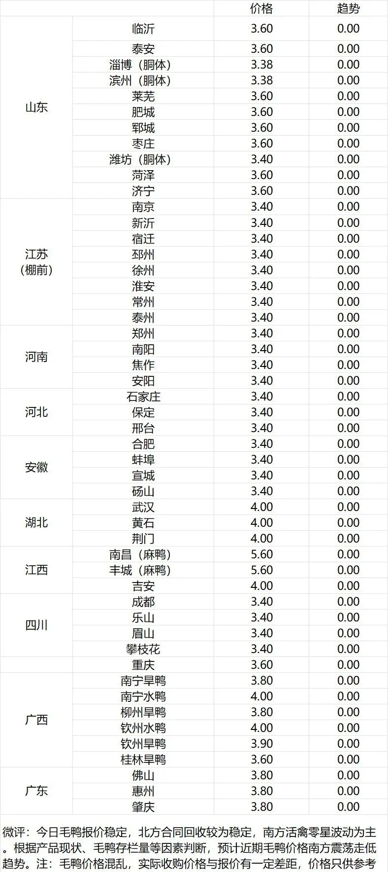 微评:鸭苗报价稳定。(注:南方只报当天价格)养殖端补栏情绪略有回升,大厂控量保价,市场走货回暖。根据产品、养殖成本及鸭苗现状分析,预计近期鸭苗价格呈止跌企稳趋势。种蛋报价稳定。温馨提示:该价格为主流厂家报价,实际销售价格以成交价格为准,价格仅供参考。