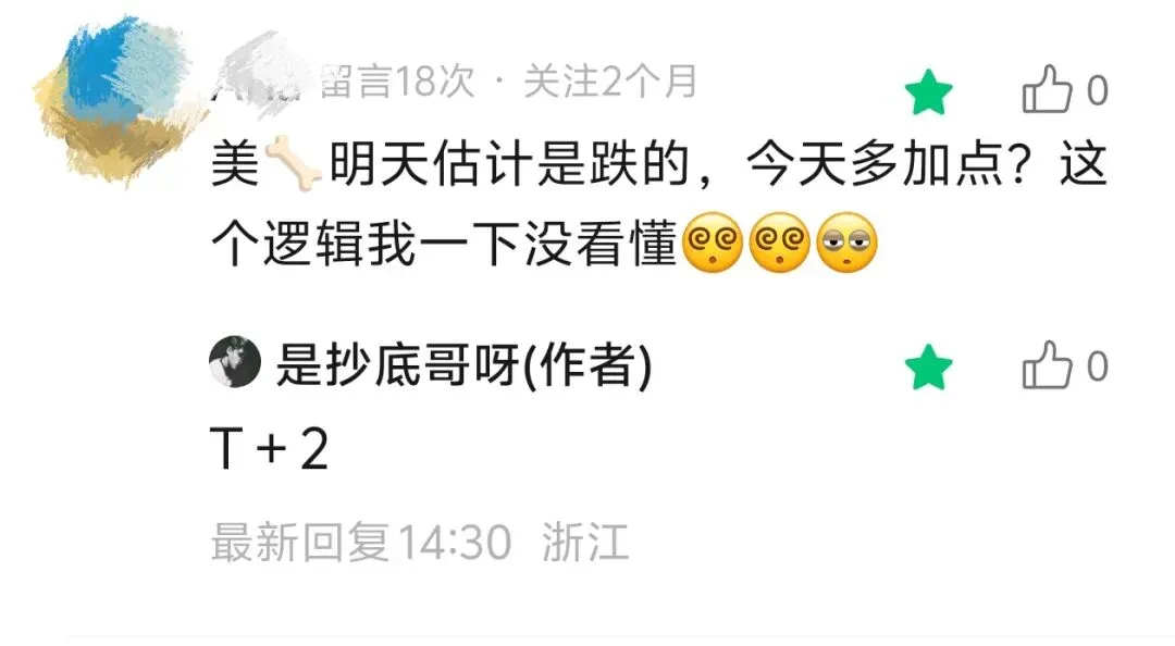 8.每天回复一个粉丝的问题。昨天有人问,你明知道明天美🥁是跌的,为什么要多加?因为美🥁是T+2。也就是你今天买,明天的涨叠跟你没有关系(也就是昨天买的,今天的跌幅跟我们没有关系),得后天才有关系,而后天又是涨的,正好!