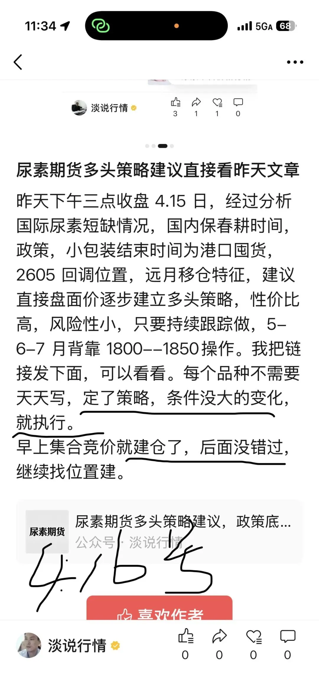 4.15 号写的尿素期货多头策略,文中直接谈到了建仓位置。4.16 号又通过贴图方式,再次强调继续买进都不算晚。从写的晚上,次日集合竞价开始进场,上涨启动。五个交易日,150 点,接近 10% 幅度。一个品种如果连发几文,就是强调行情的重要性和紧迫性。那两篇都是免费文章。不知是否有跟踪的同志。