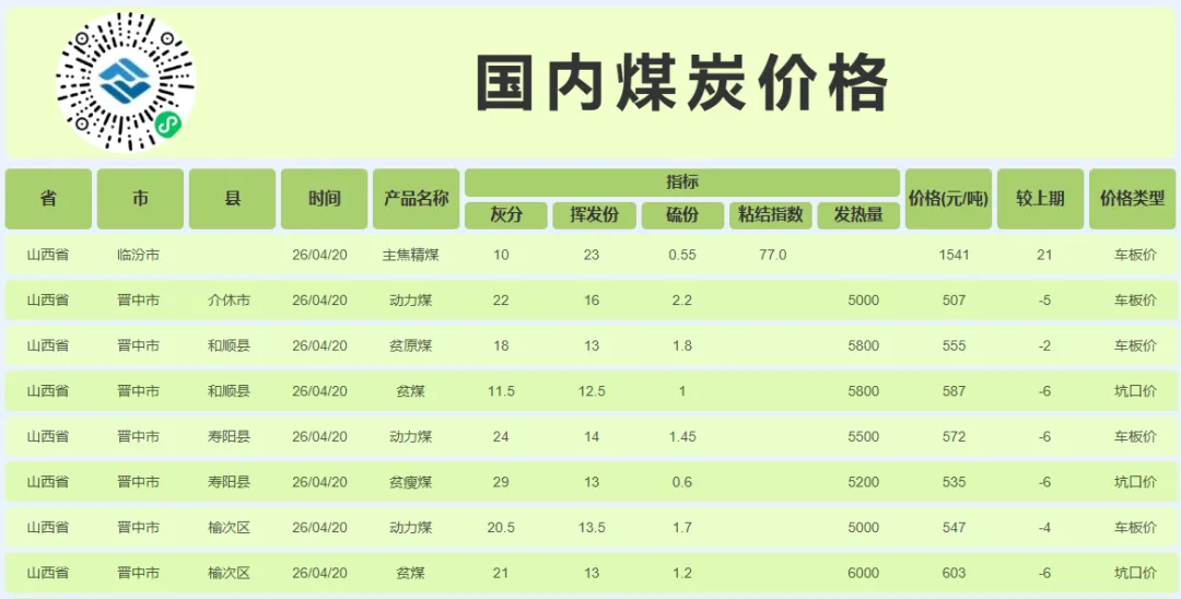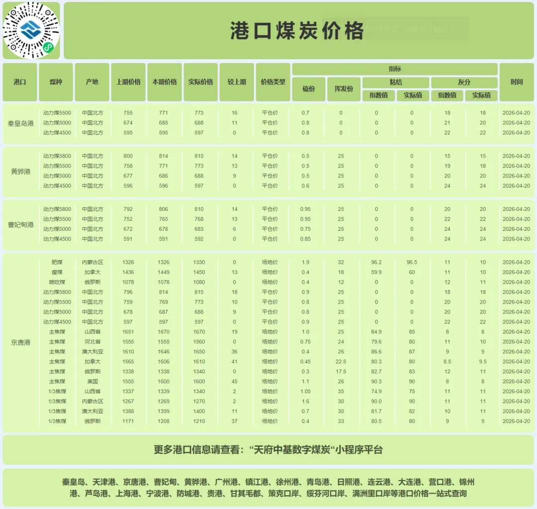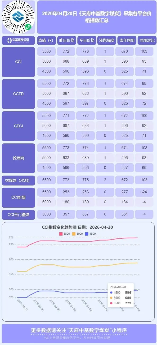 2026年4月20日,动力煤市场延续了 “强预期支撑、弱现实制约” 的窄幅震荡格局。CCI指数5500大卡、5000大卡和4500大卡价格分别报收于773元/吨、689元/吨和596元/吨,其中高卡煤种延续了自4月中旬以来的温和上涨态势,而低卡煤种价格则暂时企稳。这反映出市场在传统消费淡季中,供应端的结构性收紧与成本端的刚性支撑,正与需求端的整体疲软进行激烈博弈,价格上行空间受到明显压制。