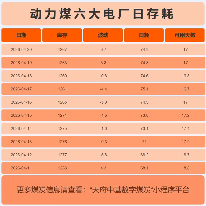 截至4月20日,沿海六大电厂日耗74.3吨,库存1267万吨,存煤可用天数约17天。
