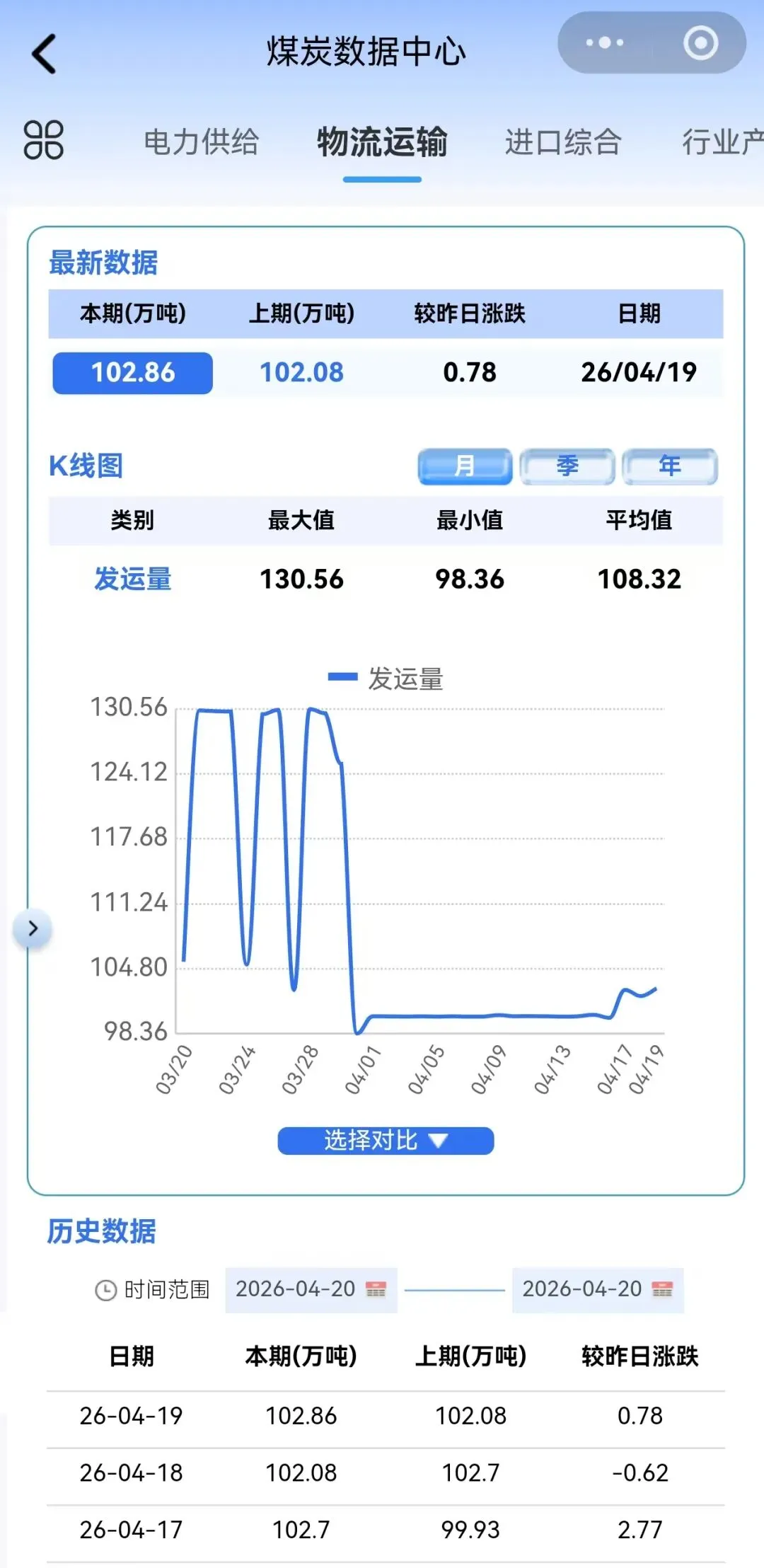 截至4月19日,大秦线日发运量为102.86万吨,较昨日上涨0.78万吨。