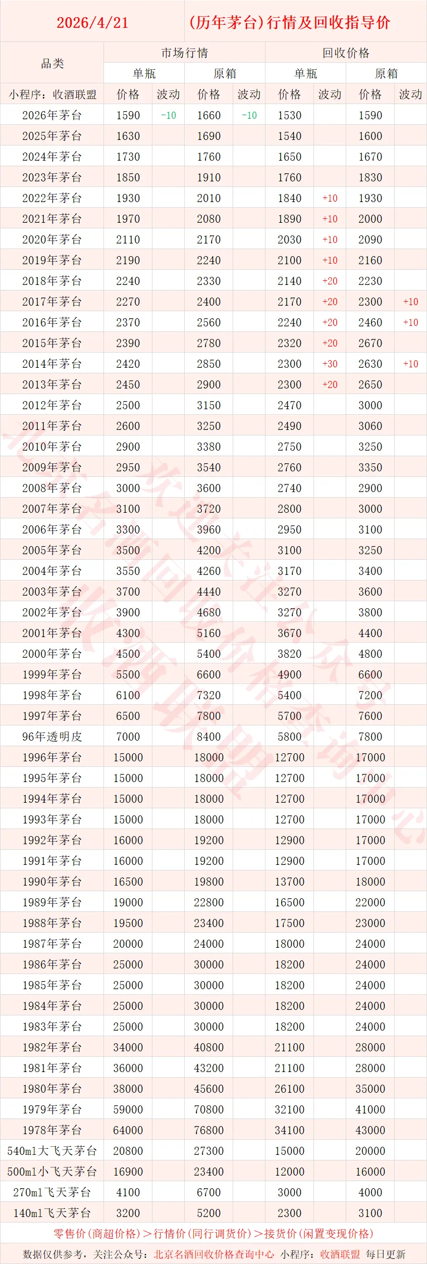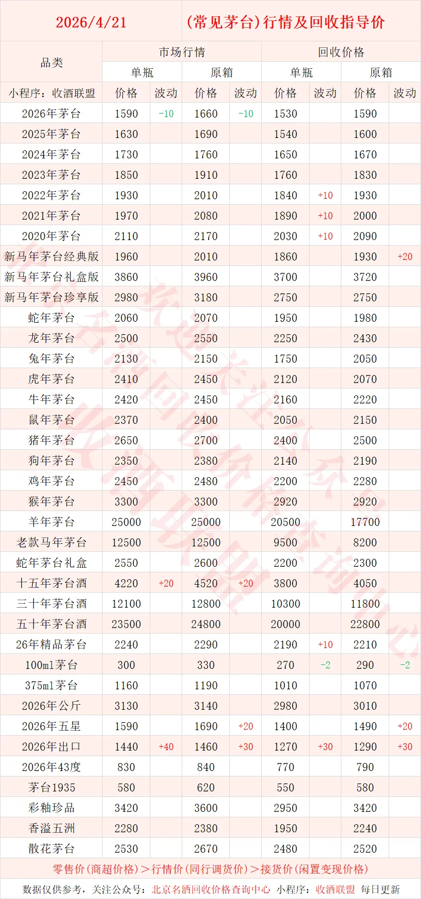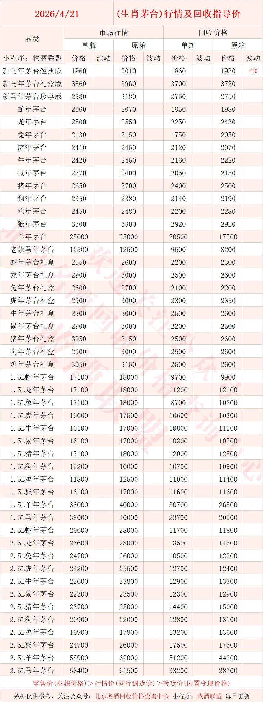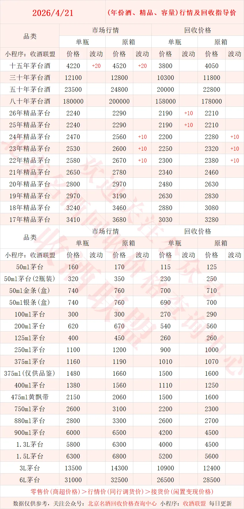 以下内容为,本公众号每日会及时更新的飞天茅台、生肖茅台、年份茅台,陈年茅台及不同毫升容量茅台的市场行情和回收报价;还包含五粮液、汾酒、剑南春、泸州老窖等国产名酒的行情及回收价,法国拉菲、木桐、玛歌等名庄红酒的回收报价,轩尼诗、马爹利、人头马等世界知名洋酒威士忌的回收参考价,每日整理不易,请点击关注支持。▪畅销类茅台行情及接货参考价▪