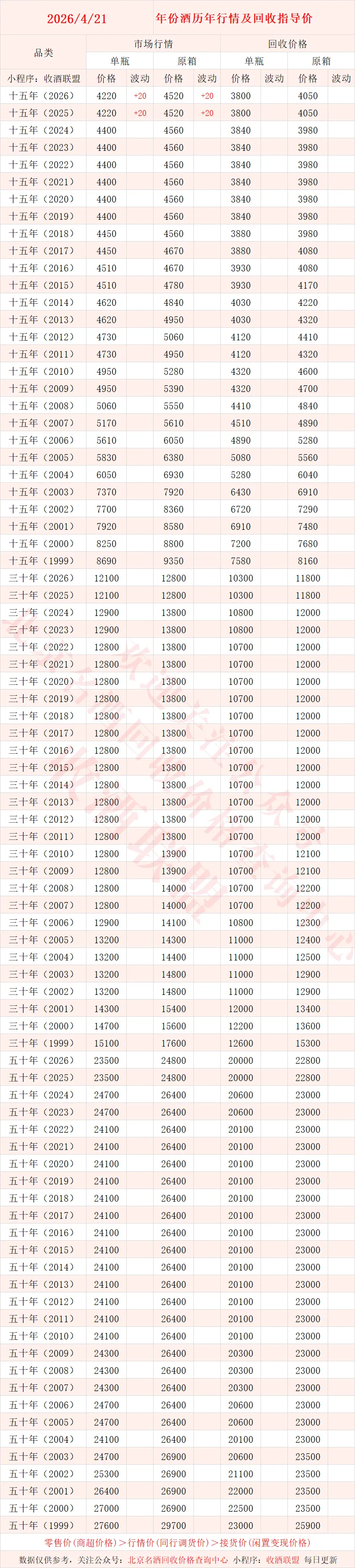 北京名酒回收价格查询中心,联系电话15652897909【同微】,专注于名酒回收行业的综合服务平台!是北京市价格认证中心、天津市价格认证中心的特聘专家,从业多年积累了各种名酒真伪鉴别经验,拥有多名品酒师、鉴定专家!累计服务数十家各省市价格认证评估,旗下小程序 “收酒联盟”,提供一键查酒价,不仅能一键查询各种名酒的价格,而且每日都会及时更新,保证你看到的都是新的准确行情。直接面向大众提供老酒,红酒,洋酒等真伪鉴定回收变现服务,回收价格专业靠谱!经过十余年磨砺,在全国100余座城市、四千多家业务会员酌情提供上门回收,是名酒回收行业中的翘楚!