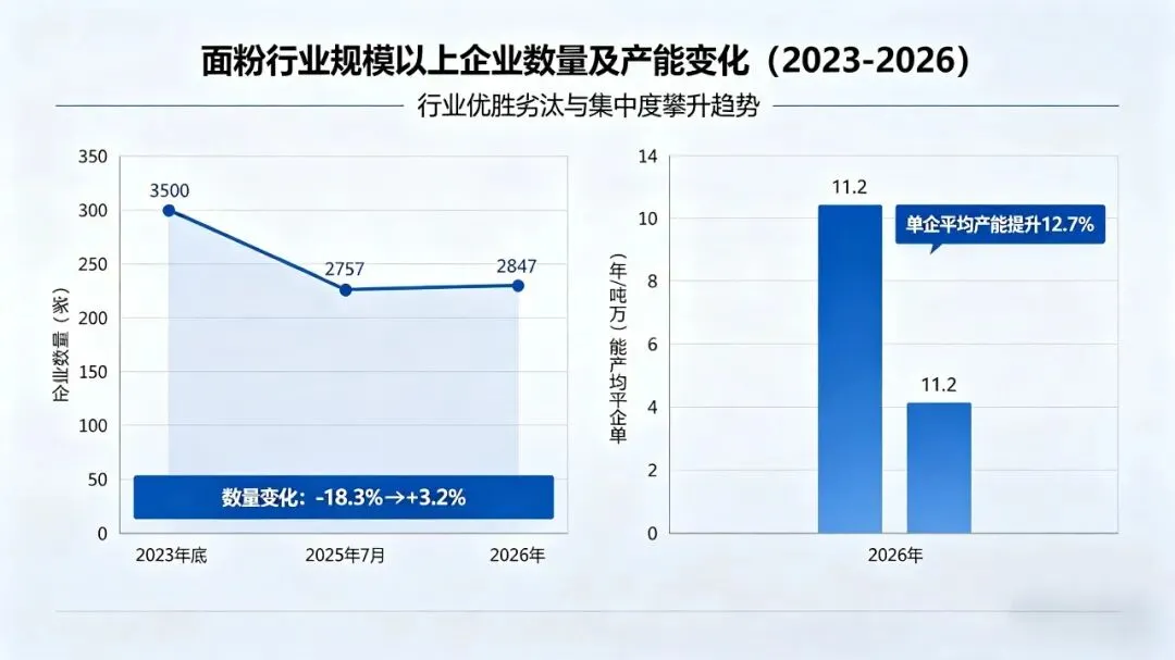 面粉行业正在经历一场静悄悄的革命。不是技术颠覆,也不是模式创新,而是最朴素的优胜劣汰——企业数量在快速减少,行业集中度持续攀升。看看最新披露的数据,这种趋势已经十分明显:到2025年7月,全国规模以上面粉企业剩下2757家,比2023年底少了743家;到了2026年,规上企业数量微调至2847家,但单企平均产能已经拉到11.2万吨/年,头部企业的优势越来越明显。
