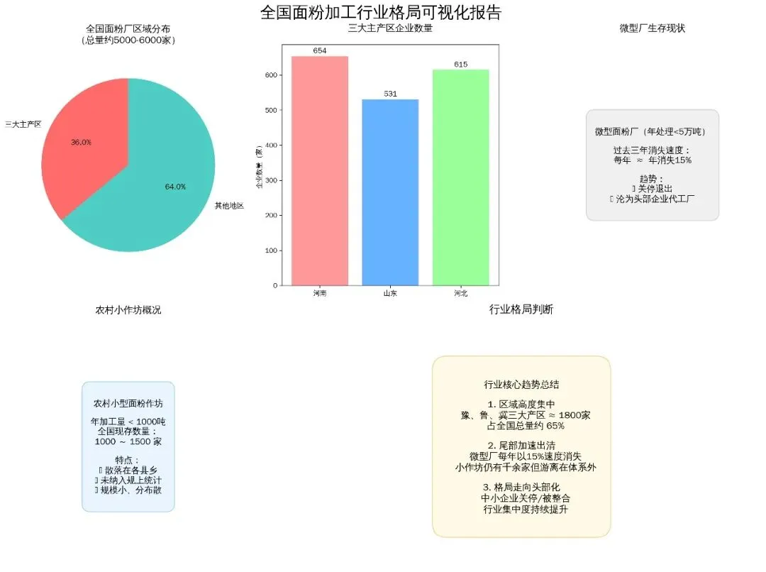 如果把中小加工厂和地方小作坊都算进去,全国面粉厂总数大概在5000到6000家之间,其中河南、山东、河北三大主产区合计约1800家,占全国总量的65%,河南有654家、山东531家。更值得关注的是,年处理能力不到5万吨的微型厂,过去三年以每年15%的速度消失,要么关门,要么沦为大厂的代工厂;年加工量不到1000吨的农村小作坊,全国还有1000到1500家,散落在各县城,基本没进入规模化统计。