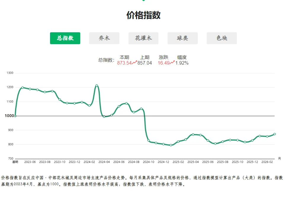 2026年3月,中国·中部花木城花木行情价格总指数收于873.54点,环比上涨16.49点,涨幅1.92%,指数呈小幅上升态势。