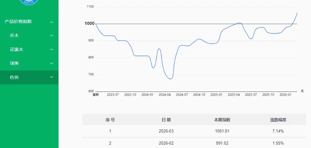 色块苗(含红花檵木、红叶石楠、金森女贞3个树种)3月价格指数收于1060.81点,相比上月上涨70.79点,涨幅7.14%,上涨明显。