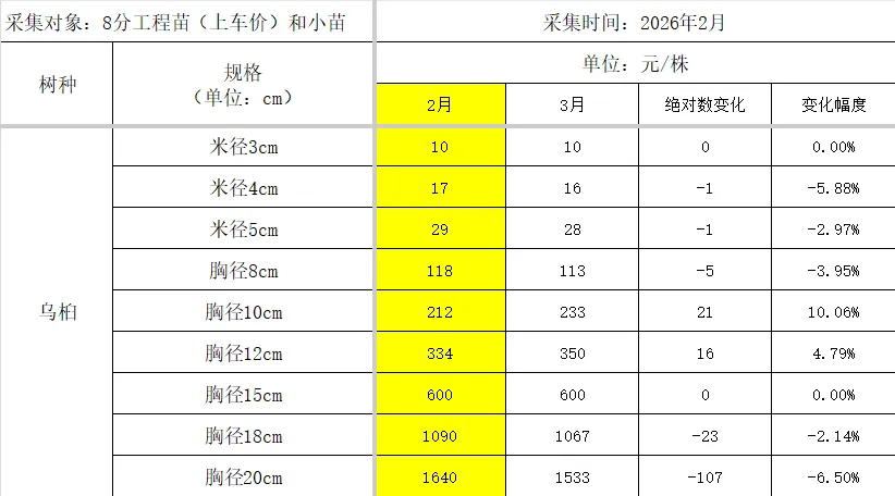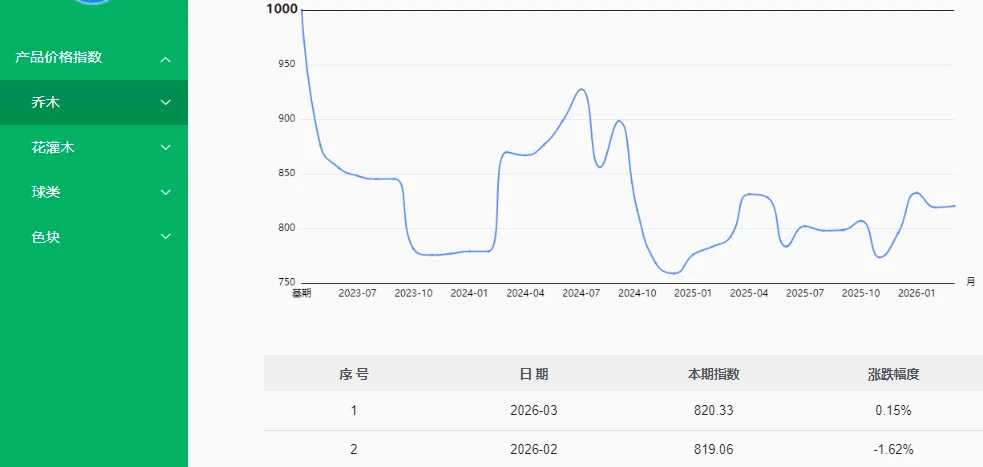 3月乔木类(包含乌桕、朴树、三角枫、广玉兰、黄山栾树、娜塔栎、鸡爪槭、无患子8个树种)价格指数收报于820.33点,环比上涨1.27点,涨幅0.15%,较上月持平。