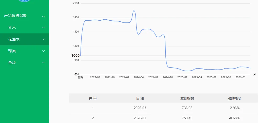 花灌木(包含垂丝海棠、桂花、红叶李、红梅、单杆紫薇5个树种)3月价格指数收于736.98点,环比下降22.51点,降幅2.96%。