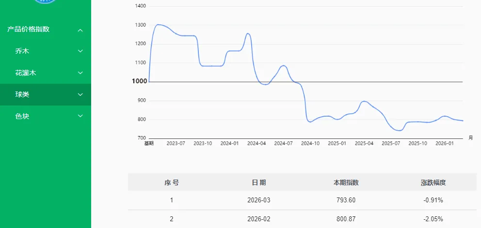 3月,球类(包含红叶石楠球、红花檵木球、海桐球、金森女贞球4个树种)指数收于793.6点,环比下降7.27点,降幅0.91%。